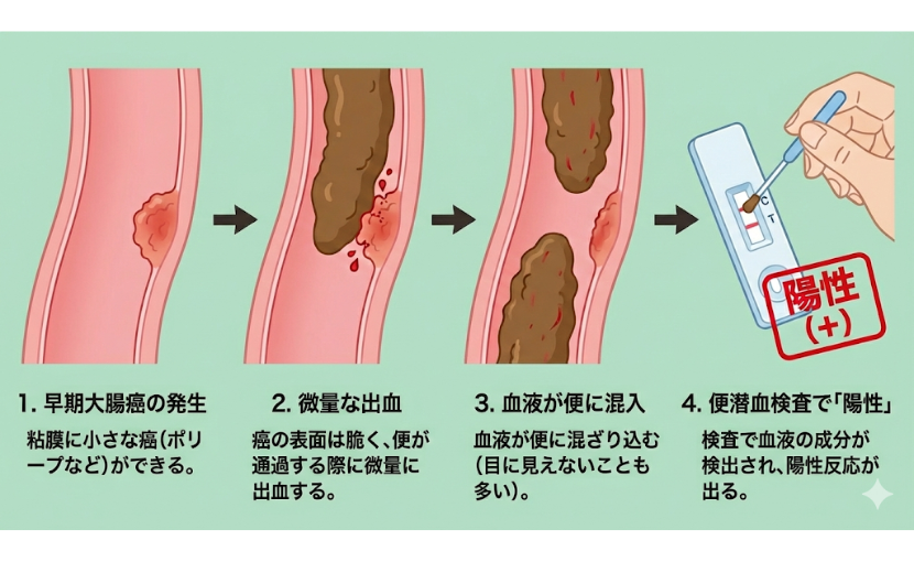 便潜血検査は、目に見えない微量な血液を感知する検査です。この段階で見つかる病変は、まだ症状を出さない早期のものである可能性が高いのです。逆に言えば、腹痛や血便、便通異常といった症状が出てからでは、がんはすでに進行している可能性が高くなります。