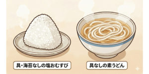 「食事を考えるのが面倒!」と感じる方は検査食をご活用ください(税込み1200円です。腹持ちもよく美味しいです♪)。具・海苔なしの塩おむすびもしくは具なしの素うどんも簡単でおすすめです。