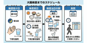 3. 検査当日の朝: 絶食、洗腸剤(サルプレップ)の服用、便の状態確認