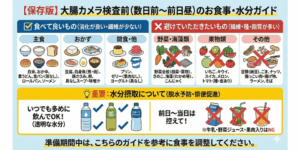 検査前の準備(食事制限と下剤の服用)は、患者様にとって大変なご負担かと思いますが、安全で質の高い検査を行うために、ご理解とご協力をお願いいたします。